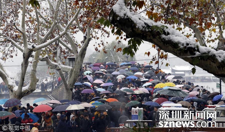 2018年12月8日,杭州,當(dāng)日市區(qū)普降大雪,市民和游客扎堆涌入西湖景區(qū),拍攝最美雪景照片以及為自己留影。