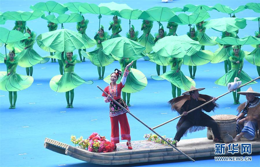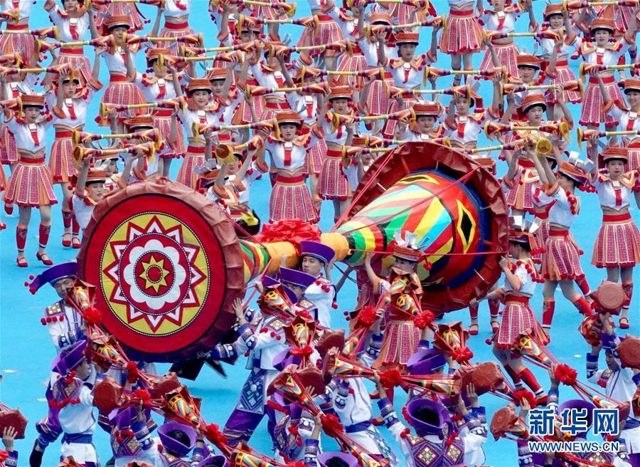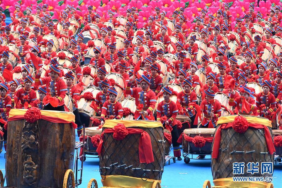12月10日,廣西壯族自治區(qū)成立60周年慶祝大會在廣西體育中心隆重舉行。這是慶祝大會上的群眾文藝表演。 新華社記者 李鑫 攝