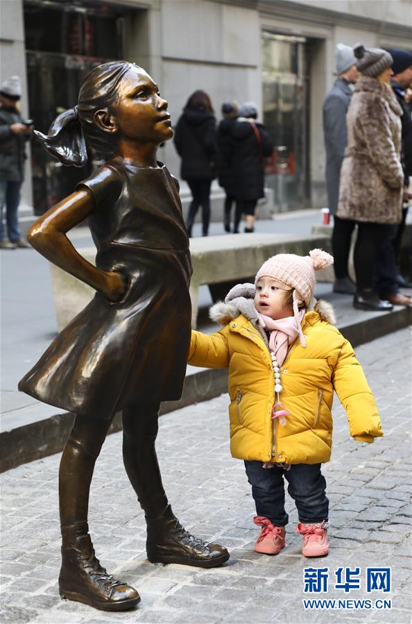 12月10日,在美國紐約,一名小女孩端詳紐約證券交易所前的“無畏女孩”銅像。 新華社記者 王迎 攝