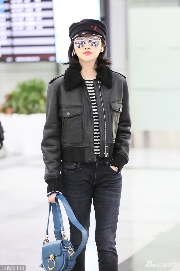 日前,景甜現(xiàn)身機(jī)場,身穿黑色皮夾克超有范兒,戴小帽酷似甜美女軍官。視覺中國/圖