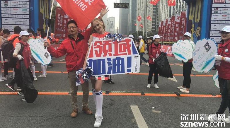 終點(diǎn)處有志愿者與啦啦隊(duì)支持者合影留念。