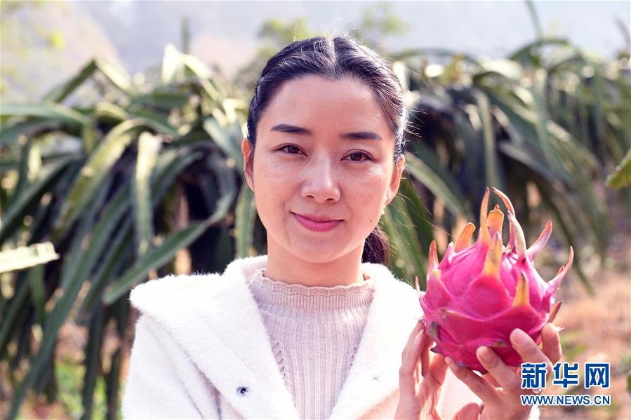 12月17日,徐慶在展示自己公司種植的火龍果。徐慶種植的火龍果出名,人又長(zhǎng)得秀氣,被稱為“小龍女”。徐慶曾經(jīng)在昆明某雜志社當(dāng)過編輯,做過生意,生活舒適。2013年,徐慶來到東川投資,把大荒地村泥石流荒灘變成綠洲,2017年種植火龍果300畝獲得豐收。村民們把土地統(tǒng)一出租,除了收取地租外,還在徐慶的果園里打工掙錢。同時(shí),村民把產(chǎn)業(yè)扶貧資金入股徐慶的公司,每年參與分紅。 新華社記者 楊宗友 攝