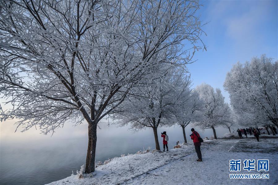 12月12日,游人在吉林省吉林市豐滿區(qū)吉豐東路松花江畔觀賞霧凇美景。