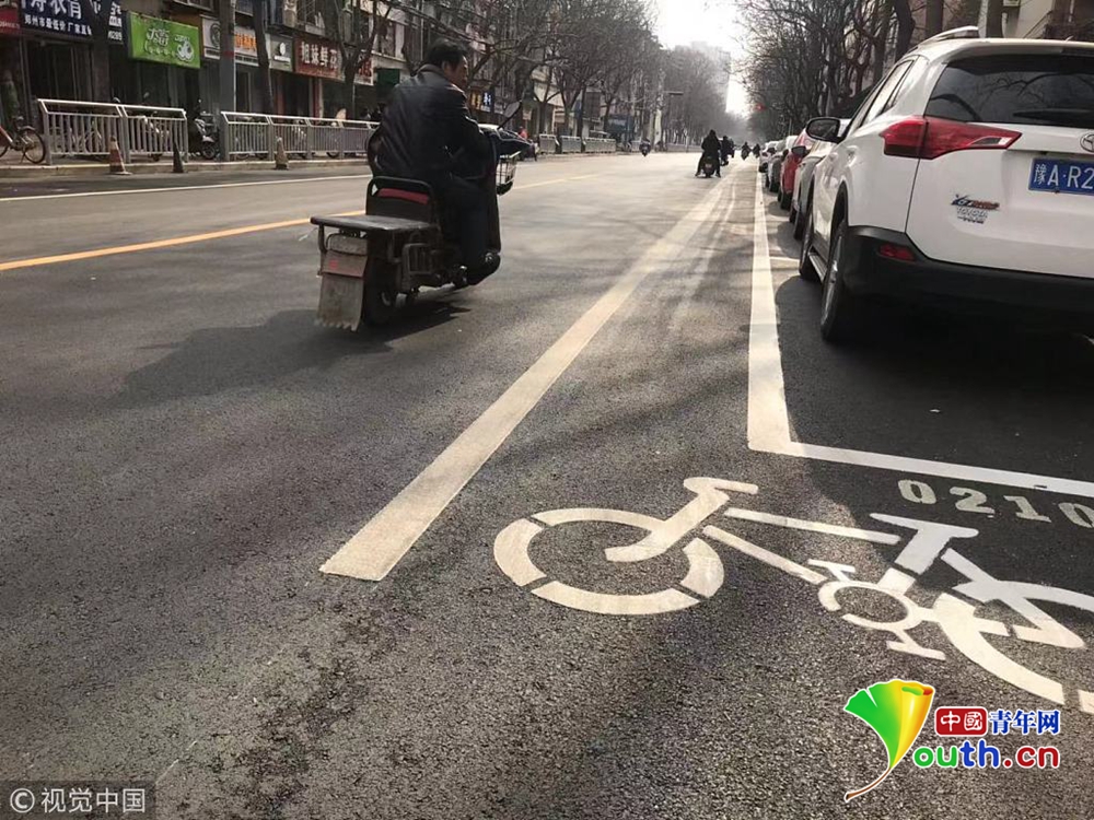 12月25日?qǐng)?bào)道,12月24日,鄭州市文化宮路有市民反映,新鋪好的文化宮路非機(jī)動(dòng)車道被剛劃的“停車位”擠得只有0.8米寬。原本2米多寬的非機(jī)動(dòng)車突然有汽車停放后,騎車經(jīng)過(guò)的行人只得被逼進(jìn)快車道通行,很不安全。