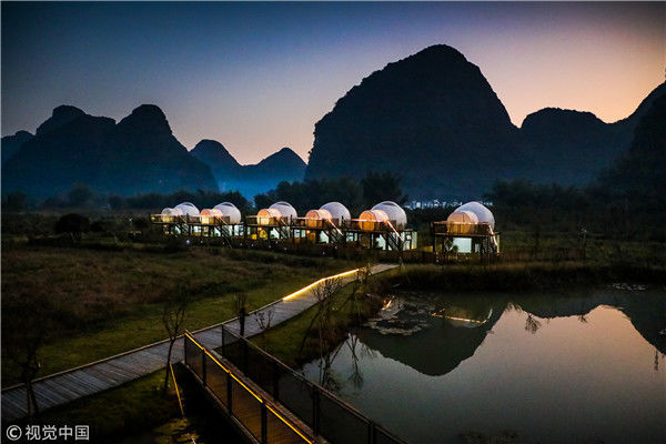 2018年12月17日,廣西桂林,陽(yáng)朔縣遇龍河畔。夜色中的泡泡屋。