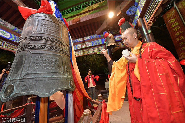 2017年1月1日零時(shí)許,海南三亞南山舉行撞鐘祈福迎新系列民俗文化活動(dòng),南山寺僧眾和游客敲響108響吉祥鐘聲,祈福國(guó)泰民安,迎接2018年的到來(lái)。
