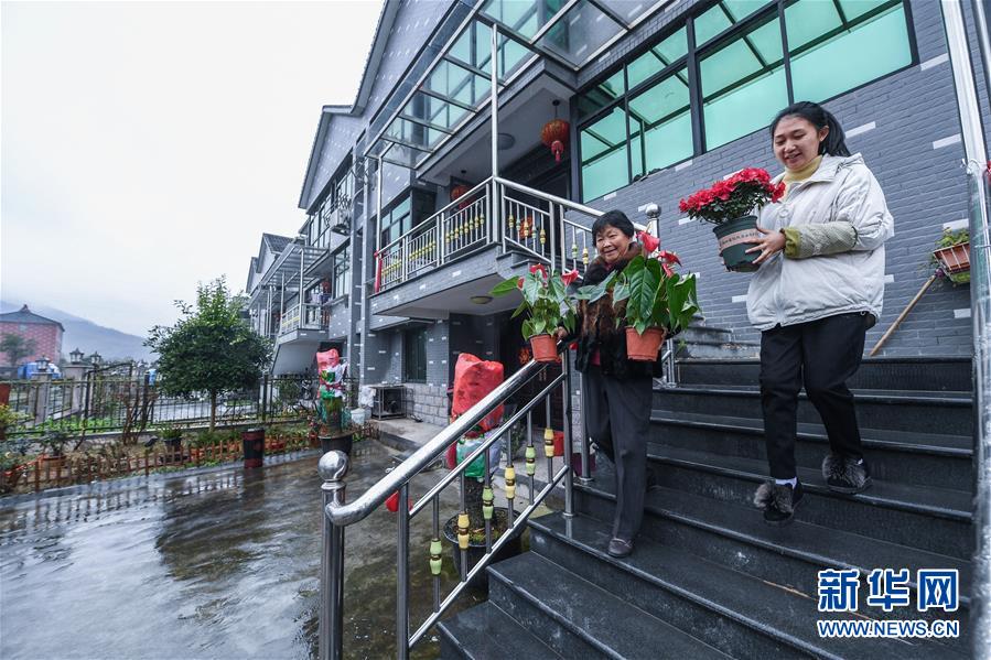 12月26日,南山村75歲的村民陸桔美(左)與村里工作人員一起用盆栽布置自家的“美麗庭院”。
