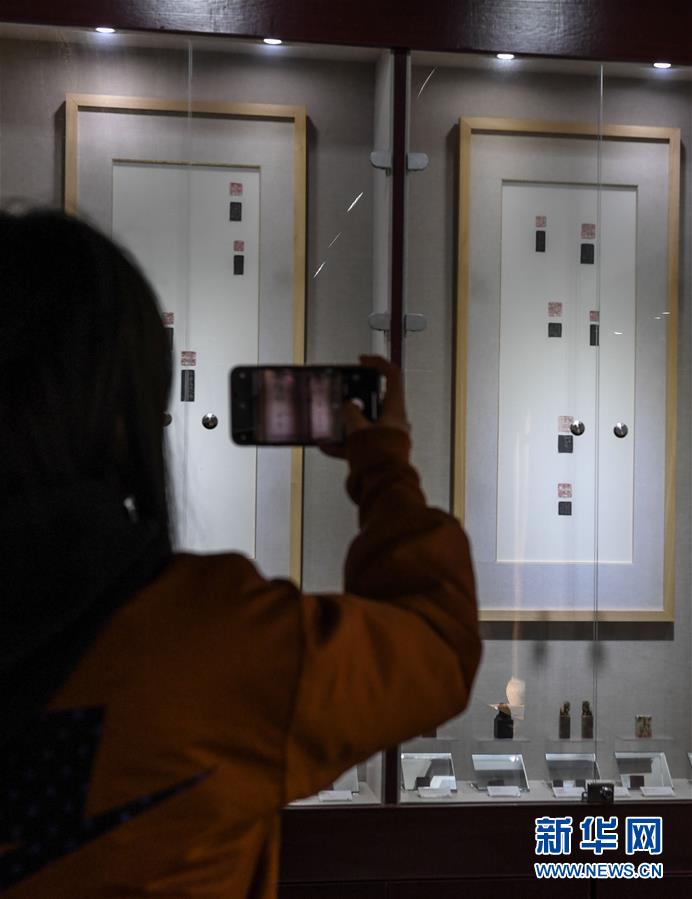 12月29日,觀眾用手機(jī)拍攝展出的金石篆刻印章。 當(dāng)日,“中國竹扇之鄉(xiāng)”——浙江省安吉縣鄣吳鎮(zhèn)舉辦傳統(tǒng)文化迎新年活動(dòng)。舉辦包括扇文化博覽會(huì)、扇面藝術(shù)展、制扇工藝展示及金石、拓印文化展示等活動(dòng),弘揚(yáng)中華優(yōu)秀傳統(tǒng)文化。 自上世紀(jì)七十年代以來,鄣吳鎮(zhèn)開始發(fā)展制扇產(chǎn)業(yè),現(xiàn)在該鎮(zhèn)有各類制扇企業(yè)80余家,制扇行業(yè)從業(yè)人員2000多人,年產(chǎn)值達(dá)2億多元。 新華社記者 徐昱攝