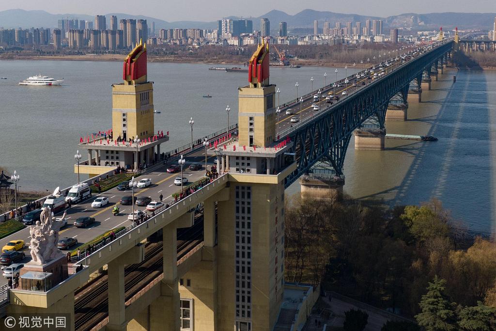 2018年12月29日,江蘇省南京市,中午12點(diǎn),維修改造后的南京長江大橋全線恢復(fù)通車。2018年12月29日還是南京長江大橋公路橋建成通車50周年紀(jì)念日。