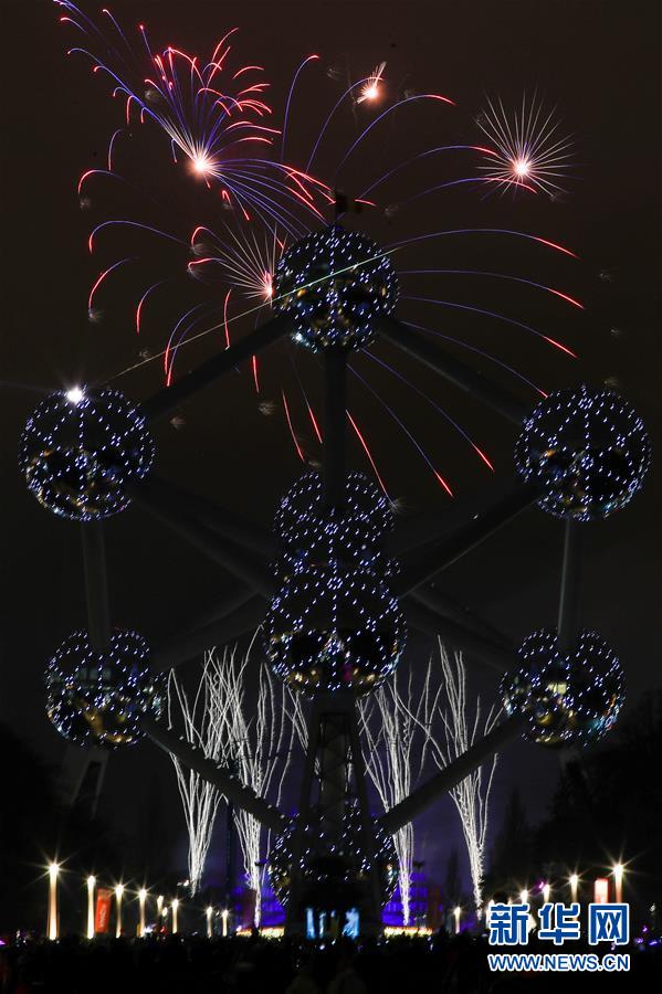 1月1日,比利時首都布魯塞爾的地標(biāo)性建筑——原子球塔附近煙花綻放。 新華社記者鄭煥松攝