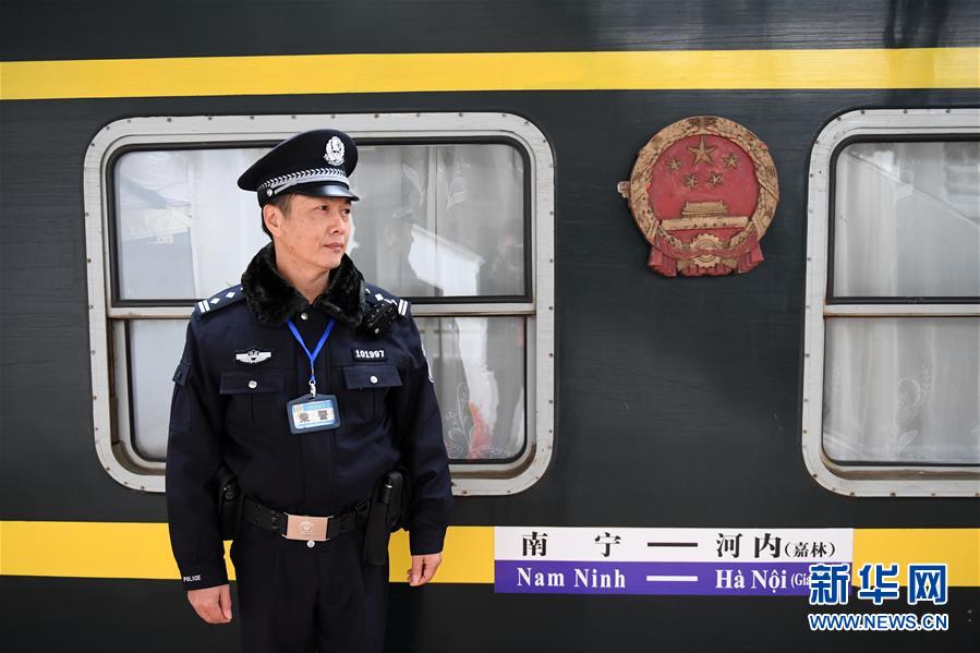1月1日,在廣西南寧火車站,楊鐵鳴在剛剛從越南河內(nèi)(嘉林)開來的列車旁值勤。楊鐵鳴是第一趟中越國(guó)際客運(yùn)列車的當(dāng)班乘警,現(xiàn)在依然在這趟列車上值守。 新華社記者陸波岸攝