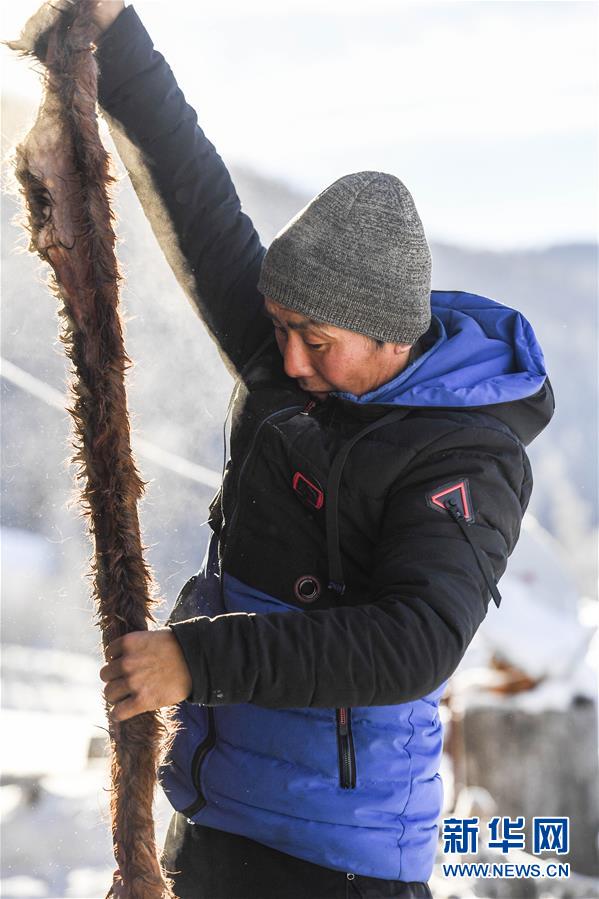 在新疆布爾津縣禾木村的一處冬季牧場(chǎng),森格爾在挑選馬小腿部位的毛皮,用于制作毛皮滑雪板(1月3日攝)。新華社記者 胡虎虎 攝