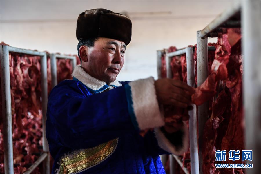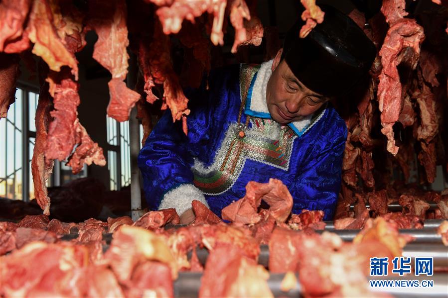 1月9日,牧民伊拉代在查看風干牛肉。 新華社記者 劉磊 攝