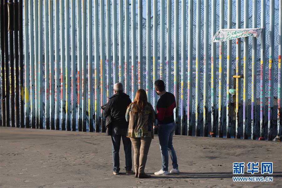 1月10日,在墨西哥邊境城市蒂華納,游客在美墨邊境墻邊交談。 新華社記者 辛悅衛(wèi) 攝