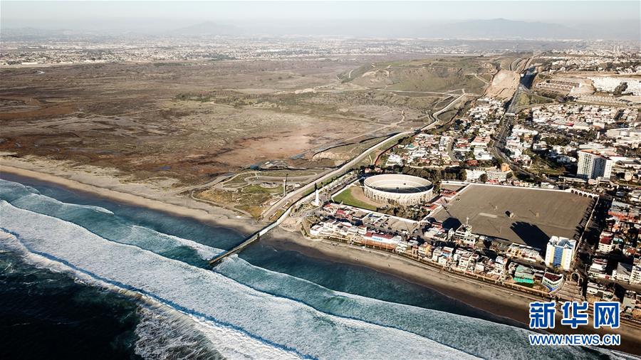 這是1月10日在墨西哥邊境城市蒂華納航拍的美墨邊境墻。畫面左側(cè)為美國,畫面右側(cè)為墨西哥。 新華社記者 辛悅衛(wèi) 攝