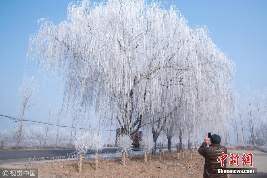 1月13日,107國(guó)道河北省定州路段出現(xiàn)霧?。?shù)掛)景觀(guān),吸引路人駐足拍照留念。王保生 攝 圖片來(lái)源:視覺(jué)中國(guó)