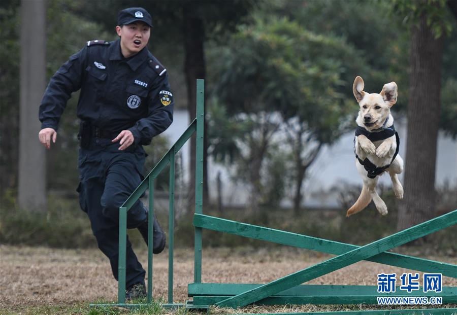 1月15日,警犬“皮特”在訓(xùn)導(dǎo)員丁巖的帶領(lǐng)下進行崗前特訓(xùn)。新華社記者 程敏 攝