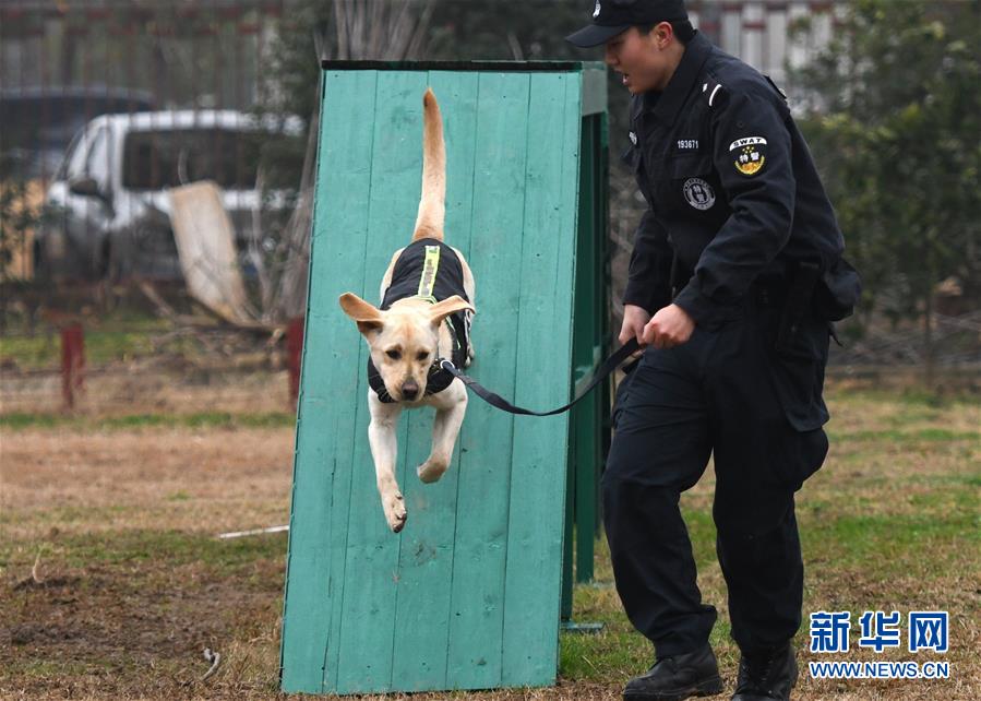 1月15日,警犬“皮特”在訓導員丁巖的帶領下進行崗前特訓。新華社記者 程敏 攝