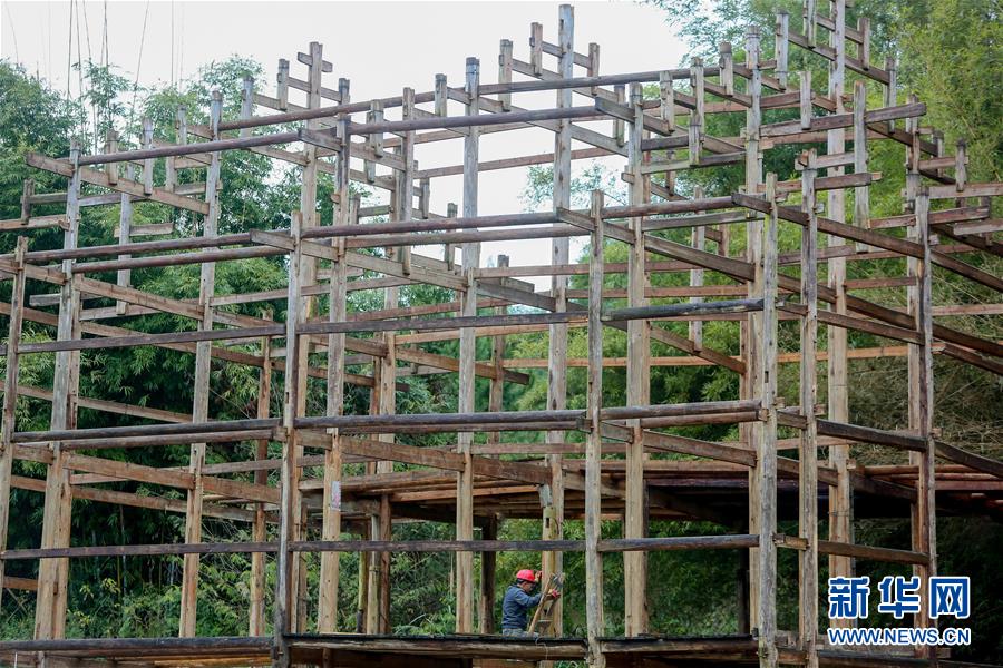 1月15日,在廣西融水苗族自治縣融水鎮(zhèn)夢嗚苗寨,工人在吊腳樓的主要結(jié)構(gòu)上施工。新華社記者 陳君清 攝