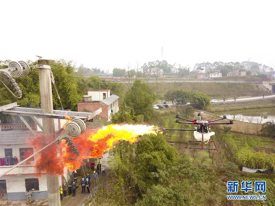 1月16日,噴火清障無人機在國網重慶永川供電公司無人機班操作手的控制下,對重慶市永川區(qū)大安街道小坎村10千伏隆安線16號桿處的一個馬蜂窩進行噴火清除(無人機航拍)。 1月16日,經過3年多的研發(fā)和測試,重慶首臺噴火清障無人機在國網重慶永川供電公司無人機班正式投用。這臺多旋翼無人機,通過搭載帶有燃料箱、油泵、自動點火裝置的噴火吊艙任務模塊,可以對影響高空電力線路安全的飄掛物進行定點障礙清除作業(yè)。 據(jù)噴火清障無人機研發(fā)負責人何濤介紹,過去高空清除異物主要靠人工進行,為保證安全經常需要停電作業(yè),因此他們結合實際工作經驗和高空電力線路的自身特點,設計和制造出了噴火清障無人機。2018年測試期間,國網重慶永川供電公司無人機班在多種環(huán)境下成功執(zhí)行了50多次高空電力線路清障作業(yè)。 新華社記者 劉潺 攝