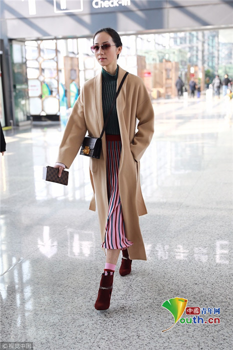 2019年1月17日,上海,韓雪現(xiàn)身機(jī)場(chǎng),穿著條紋紗裙露出小腿,十分抗凍,她搭配經(jīng)典的駝色大衣,氣質(zhì)出眾在機(jī)場(chǎng)人群中相當(dāng)搶鏡。