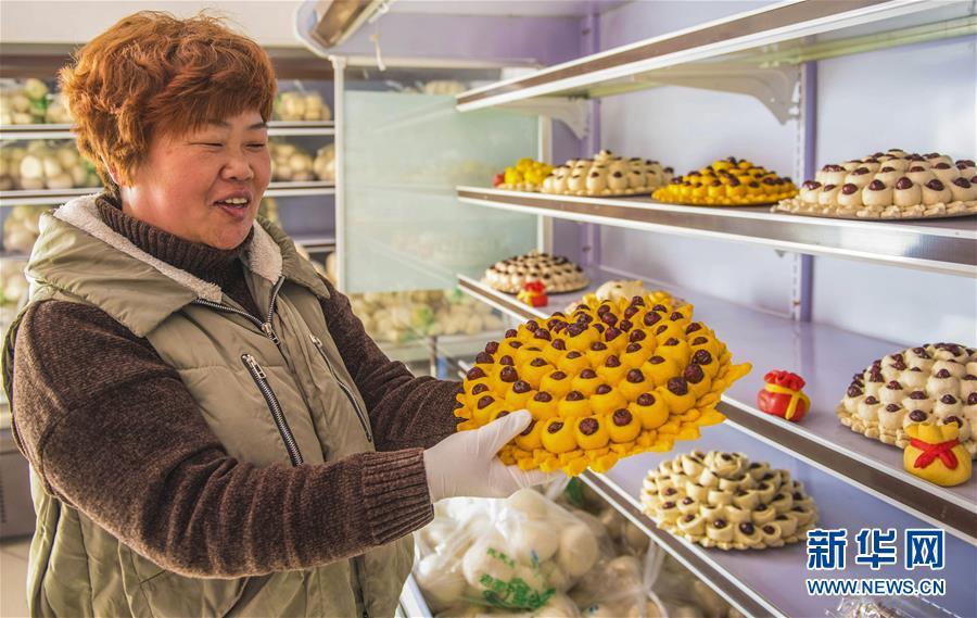 1月31日,河北黃驊市一家面花作坊的工人在查看面花。 河北黃驊市有著過年蒸面花的習(xí)俗。春節(jié)前夕,當(dāng)?shù)孛婊ㄖ谱鞴S加班加點(diǎn)制作面花,供應(yīng)春節(jié)市場。 新華社記者牟宇攝