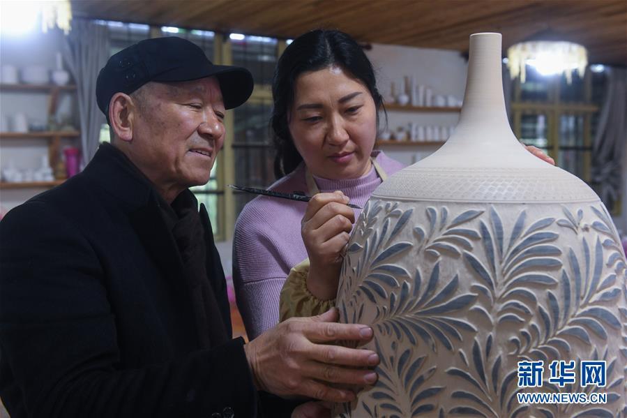 2月16日,陳新華(左)在指導徒弟進行刻花創(chuàng)作。新華社記者 徐昱 攝