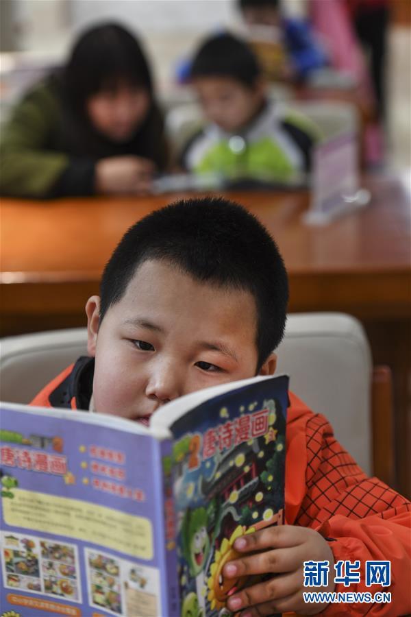 2月24日,8歲的郝秋巖在府谷縣圖書館少兒閱覽區(qū)閱讀。