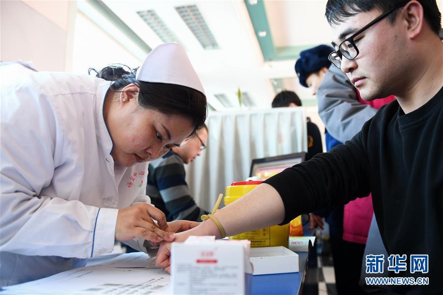 2月24日,志愿者在錫林郭勒盟中心血站捐獻血小板。 內(nèi)蒙古自治區(qū)錫林郭勒盟“2·23”重大事故傷者正在錫林郭勒盟醫(yī)院、錫林郭勒盟蒙醫(yī)醫(yī)院接受救治。因用血需求量大,當?shù)匮獛鞄齑嬉欢鹊陀诰渚€。在當?shù)卣h下,各單位職工、市民紛紛前往錫林郭勒盟中心血站獻血。截至24日16時,已有220余名志愿者完成獻血,采集全血6.8萬毫升,機采血小板9個治療量。 新華社記者 劉磊 攝