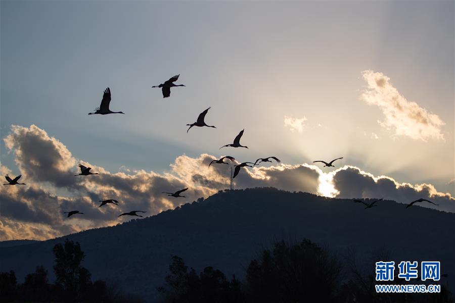 3月7日,在以色列阿格蒙胡拉鳥類和自然公園,一群灰鶴在天空中飛翔。新華社記者郭昱攝