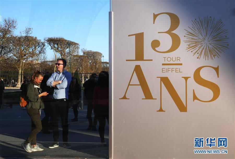 3月30日,在法國巴黎,人們走過慶祝埃菲爾鐵塔落成130周年的宣傳牌。于1889年3月31日正式落成的法國巴黎埃菲爾鐵塔迎來130歲生日。從30日起,包括演出、冒險游戲、圖片展在內的多項活動在埃菲爾鐵塔舉行,為這座宏偉建筑慶生。新華社記者 高靜 攝