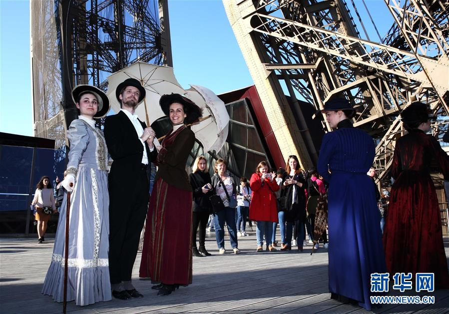 3月30日,在法國巴黎,音樂劇《300米高塔》的演員身著19世紀服裝在埃菲爾鐵塔一層平臺合影。于1889年3月31日正式落成的法國巴黎埃菲爾鐵塔迎來130歲生日。從30日起,包括演出、冒險游戲、圖片展在內(nèi)的多項活動在埃菲爾鐵塔舉行,為這座宏偉建筑慶生。新華社記者 高靜 攝