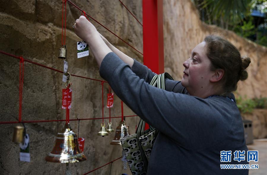 4月6日,在美國(guó)圣迭戈動(dòng)物園,一名游客在“大熊貓友誼墻”上掛上祝福簽。新華社記者李穎攝