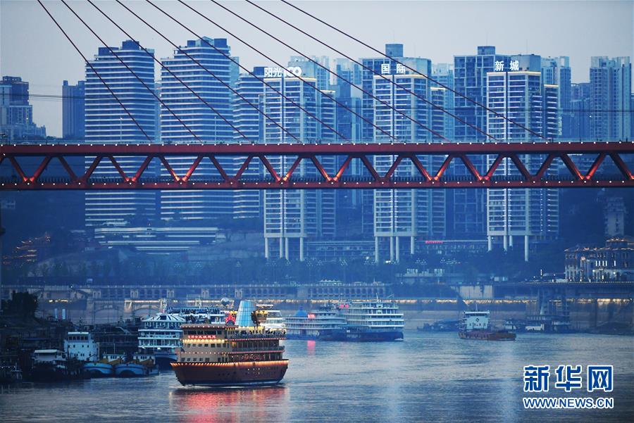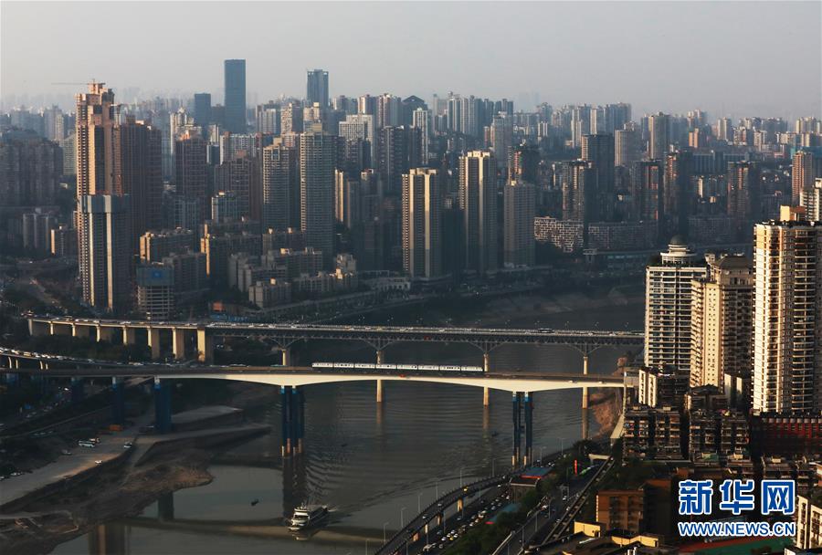 這是4月7日拍攝的重慶朝天門長(zhǎng)江大橋一帶景象。 千里為重,廣大為慶。城在山水間、山水在城中,重慶頗具特色的立體城市景觀是城市靚麗的名片。 新華社記者 王全超 攝