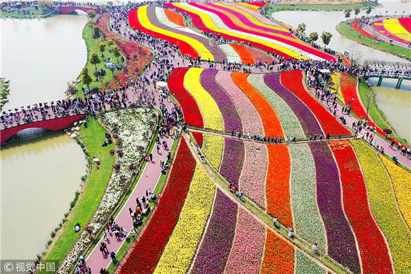 2019年4月6日,江蘇鹽城市大豐荷蘭花海的300萬株郁金香隨風(fēng)盛開,吸引了眾多市民和游客前來觀賞。從空中看,一片片彩色的郁金香花田仿佛巨幅彩帶,將數(shù)百畝花海裝扮得分外美麗。楊素平/視覺中國
