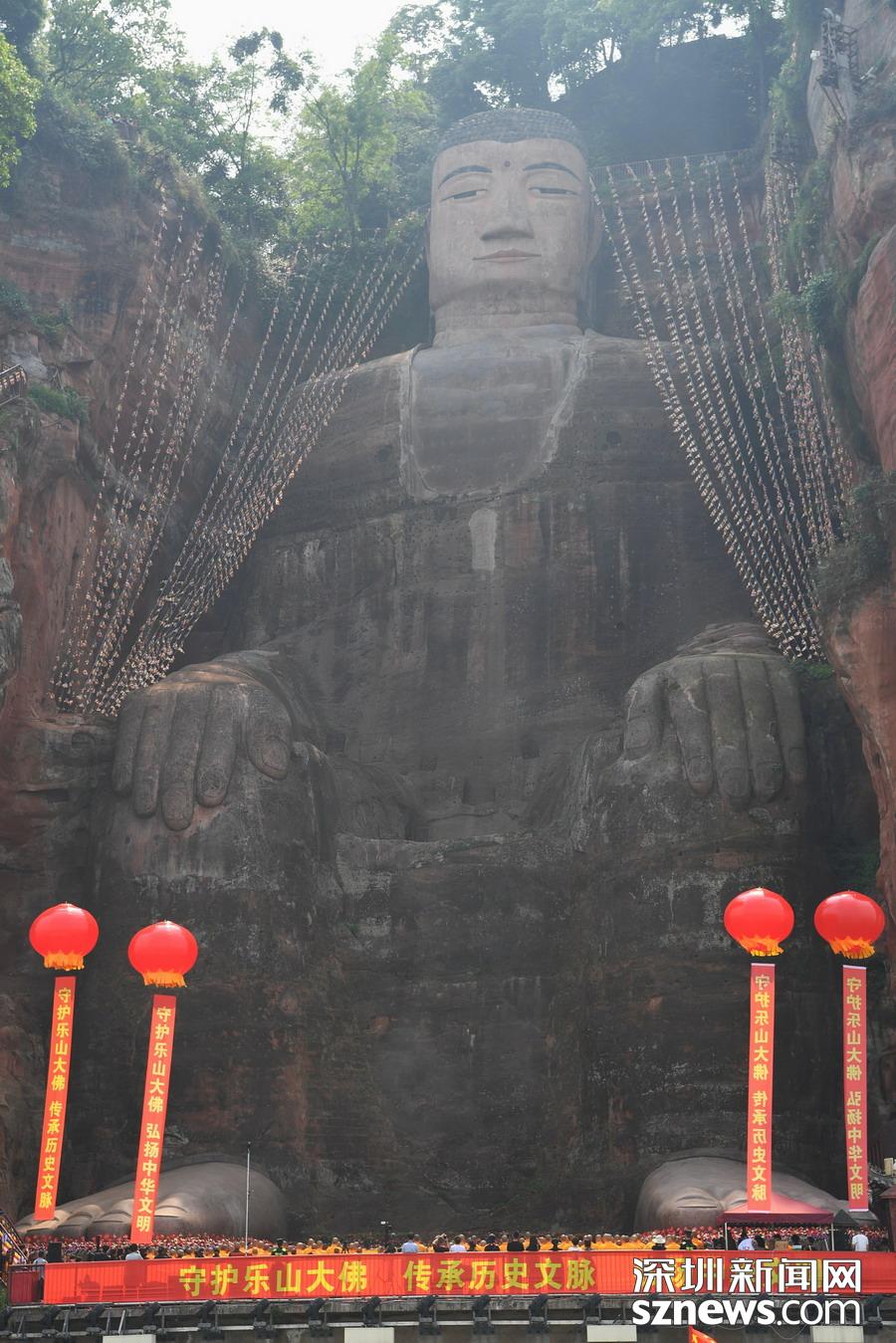 2019年4月26日,四川樂山,樂山大佛經(jīng)過閉關(guān)“體檢”、美容保養(yǎng)及智能監(jiān)測等環(huán)節(jié)后,胸腹部開裂險(xiǎn)情排除,生物病害得到有效控制,大佛正式出關(guān)。