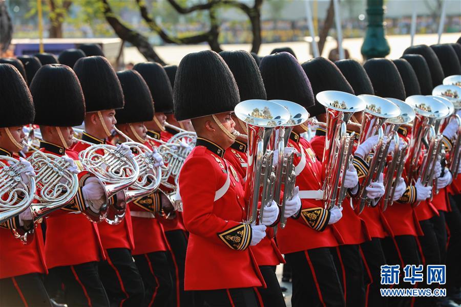 5月5日,儀仗隊在曼谷大王宮附近舉行的泰國國王加冕典禮巡游上列隊前進。 新華社記者 張可任 攝