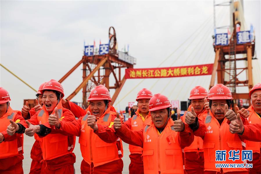 4月2日,工人慶祝池州長(zhǎng)江公路大橋順利合龍。 新華社記者曹力攝