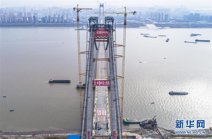12月29日,武漢楊泗港長江大橋順利合龍(無人機(jī)拍攝)。新華社記者 肖藝九 攝