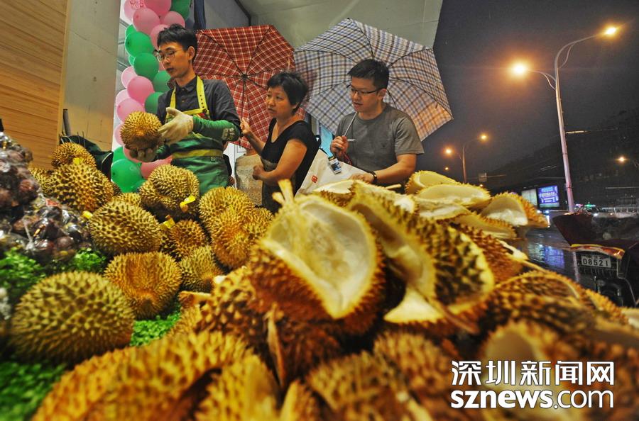 2017年6月5日夜里,武漢一家水果店正進(jìn)行金枕榴蓮打折促銷,門前堆積如山的榴蓮殼頗為壯觀,不少市民聞著榴蓮散發(fā)的濃郁味道前來排隊選購,雨夜里食客們依舊絡(luò)繹不絕。