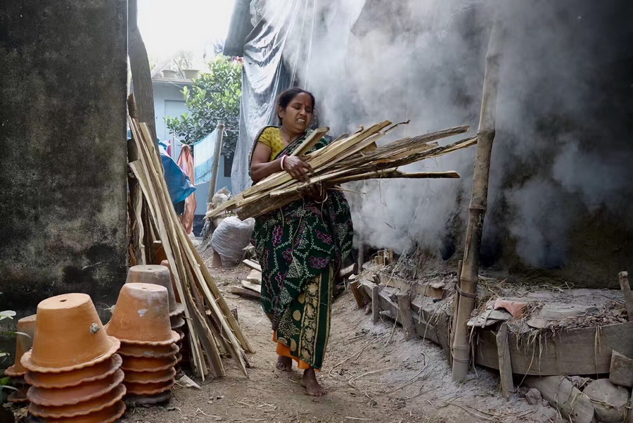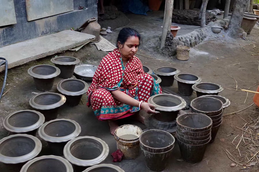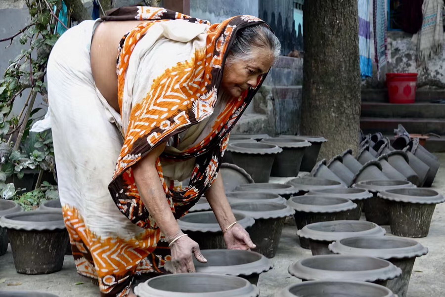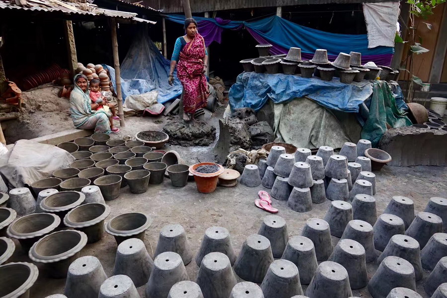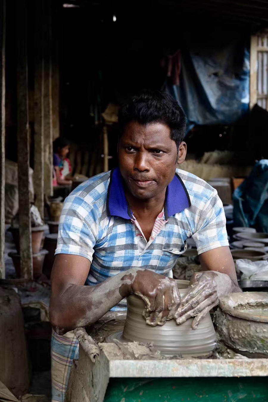 達(dá)卡遠(yuǎn)郊區(qū)一個(gè)印度教徒聚居的村莊,幾乎家家戶戶都開(kāi)辦制陶作坊,以傳統(tǒng)工藝制作陶盆、陶罐、陶盤和建筑裝飾陶器,遠(yuǎn)銷孟加拉國(guó)內(nèi)各地。李仁奇 攝