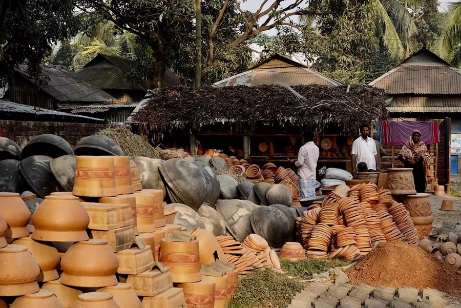 達(dá)卡遠(yuǎn)郊區(qū)一個(gè)印度教徒聚居的村莊,幾乎家家戶戶都開辦制陶作坊,以傳統(tǒng)工藝制作陶盆、陶罐、陶盤和建筑裝飾陶器,遠(yuǎn)銷孟加拉國(guó)內(nèi)各地。李仁奇 攝