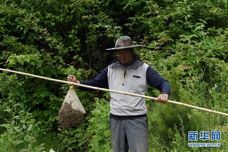 5月10日,在甘肅省隴南市徽縣大河店鎮(zhèn)硬灣村,蜂農(nóng)周仲頤在收蜂。 甘肅省隴南市徽縣大河店鎮(zhèn)硬灣村位于秦巴山區(qū)深處,2017年,在當?shù)卣姆龀窒拢堁吕铣裁垧B(yǎng)殖農(nóng)民專業(yè)合作社成立,蜂農(nóng)們將傳統(tǒng)養(yǎng)蜂技藝和現(xiàn)代加工方式相結(jié)合,并通過電商等渠道打開銷路,有效帶動了當?shù)刎毨Т迕衩撠氈赂?。目前整個合作社共有蜂箱2000余個,每箱每年可帶來三四千元的收入。 新華社記者 馬寧 攝