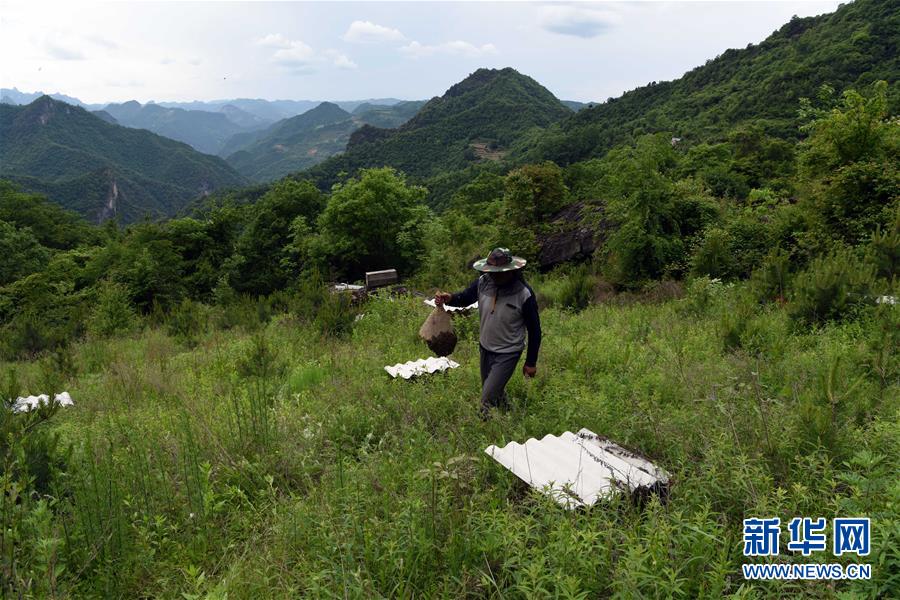 5月10日,在甘肅省隴南市徽縣大河店鎮(zhèn)硬灣村,蜂農(nóng)周仲頤在收蜂。 甘肅省隴南市徽縣大河店鎮(zhèn)硬灣村位于秦巴山區(qū)深處,2017年,在當?shù)卣姆龀窒?,龍崖老巢蜜養(yǎng)殖農(nóng)民專業(yè)合作社成立,蜂農(nóng)們將傳統(tǒng)養(yǎng)蜂技藝和現(xiàn)代加工方式相結(jié)合,并通過電商等渠道打開銷路,有效帶動了當?shù)刎毨Т迕衩撠氈赂弧D壳罢麄€合作社共有蜂箱2000余個,每箱每年可帶來三四千元的收入。 新華社記者 馬寧 攝