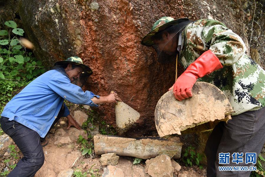 5月10日,在甘肅省隴南市徽縣大河店鎮(zhèn)硬灣村,蜂農(nóng)周仲頤(右)在收蜂。 甘肅省隴南市徽縣大河店鎮(zhèn)硬灣村位于秦巴山區(qū)深處,2017年,在當?shù)卣姆龀窒?,龍崖老巢蜜養(yǎng)殖農(nóng)民專業(yè)合作社成立,蜂農(nóng)們將傳統(tǒng)養(yǎng)蜂技藝和現(xiàn)代加工方式相結(jié)合,并通過電商等渠道打開銷路,有效帶動了當?shù)刎毨Т迕衩撠氈赂弧D壳罢麄€合作社共有蜂箱2000余個,每箱每年可帶來三四千元的收入。 新華社記者 馬寧 攝