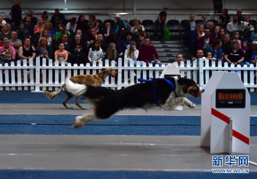 5月19日,在德國多特蒙德舉行的寵物展上,兩只狗狗參加速度競賽。 為期三天的德國多特蒙德“狗和貓”寵物展19日落幕。寵物展期間,人們帶著自己的“萌寵”來到會場,參與寵物跳水、舞蹈、選美等趣味比賽,并與其他寵物愛好者及展商交流互動。 新華社記者逯陽攝