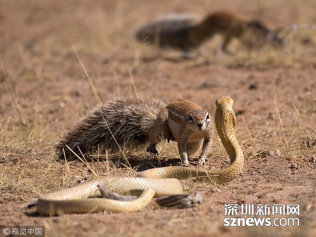 當(dāng)?shù)貢r(shí)間2016年10月25日,南非博茨瓦納的卡格拉格帝越界公園, 眼鏡蛇和地松鼠之間發(fā)生激烈打斗,但都沒有受傷。野生動(dòng)物攝影師Hannes Rossouw拍攝了這一過(guò)程。