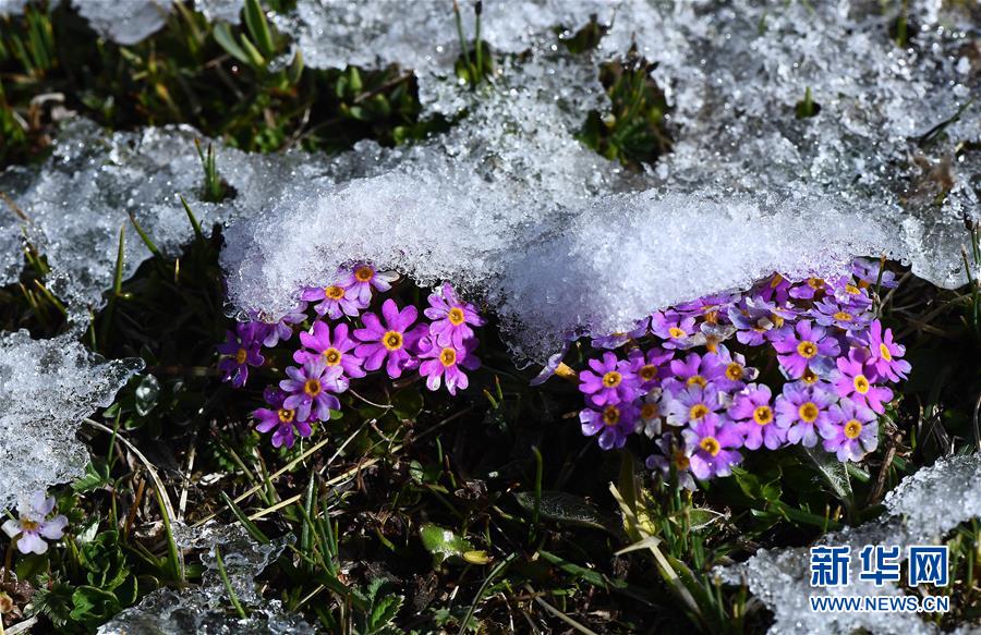 在年保玉則,野花上的冰雪漸漸消融(5月21日攝)。 年保玉則位于青海省果洛藏族自治州久治縣境內(nèi),地處三江源國家公園核心區(qū),主峰海拔5369米。年保玉則周圍森林茂密,湖泊星羅棋布,棲息著裸鯉、巖羊、白唇鹿、棕熊等珍稀動物。 新華社記者 張宏祥 攝