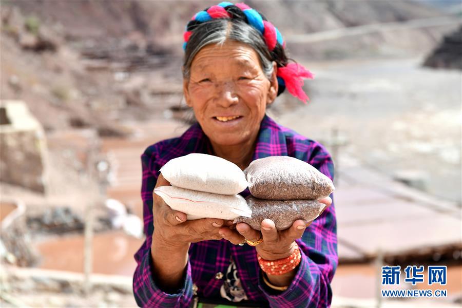 5月22日,西藏納西民族鄉(xiāng)加達村村民曲措展示所賣鹽類商品。位于西藏昌都芒康縣瀾滄江畔的古鹽田,至今仍保持最原始的手工曬鹽方式。據(jù)史料記載,唐朝時期當?shù)鼐烷_始曬鹽。鹽田在瀾滄江兩岸依山而建,由多根木柱搭架,架上用透水性強的泥土鋪成平面夯實,當?shù)鼐用駨臑憸娼系柠}井、鹽池中取出鹵水倒入鹽田,經陽光蒸曬、風干,結晶成鹽。遠遠望去,鹽田錯落有致,田中鹵水宛若鏡面,形成壯麗奇觀。新華社記者李鑫 攝