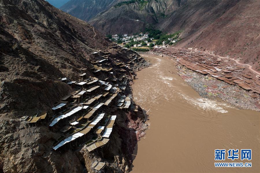 這是西藏芒康縣納西民族鄉(xiāng)的古鹽田景觀(5月22日無(wú)人機(jī)拍攝)。位于西藏昌都芒康縣瀾滄江畔的古鹽田,至今仍保持最原始的手工曬鹽方式。據(jù)史料記載,唐朝時(shí)期當(dāng)?shù)鼐烷_(kāi)始曬鹽。鹽田在瀾滄江兩岸依山而建,由多根木柱搭架,架上用透水性強(qiáng)的泥土鋪成平面夯實(shí),當(dāng)?shù)鼐用駨臑憸娼系柠}井、鹽池中取出鹵水倒入鹽田,經(jīng)陽(yáng)光蒸曬、風(fēng)干,結(jié)晶成鹽。遠(yuǎn)遠(yuǎn)望去,鹽田錯(cuò)落有致,田中鹵水宛若鏡面,形成壯麗奇觀。新華社記者李鑫 攝